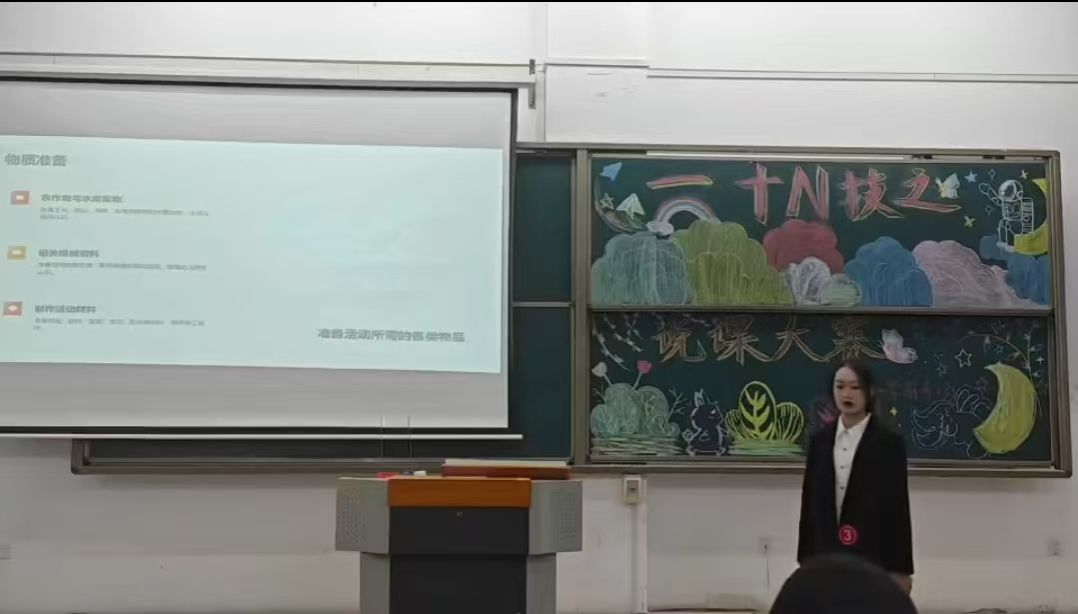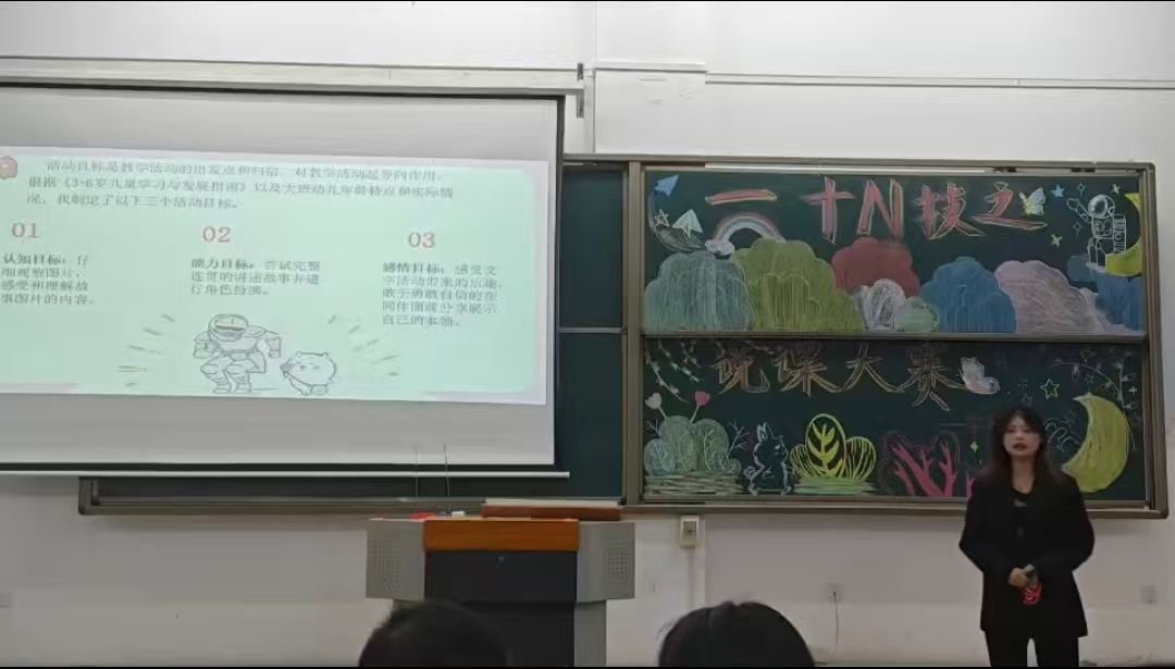 三尺讲台,绽放风采;一片丹心,孕育未来。为进一步夯实学前教育专业学生的教学基本功,锤炼教学技能。教育万博体育官网于2025年10月24日18:30在综合楼1112教室开展了“1+N技”之说课大赛。出席本次大赛的评委老师有教育万博体育官网经柏龙院长,辅导员刘皓源老师,专职教师张东月老师、贾润竹老师、孙志维老师、詹梦希老师。