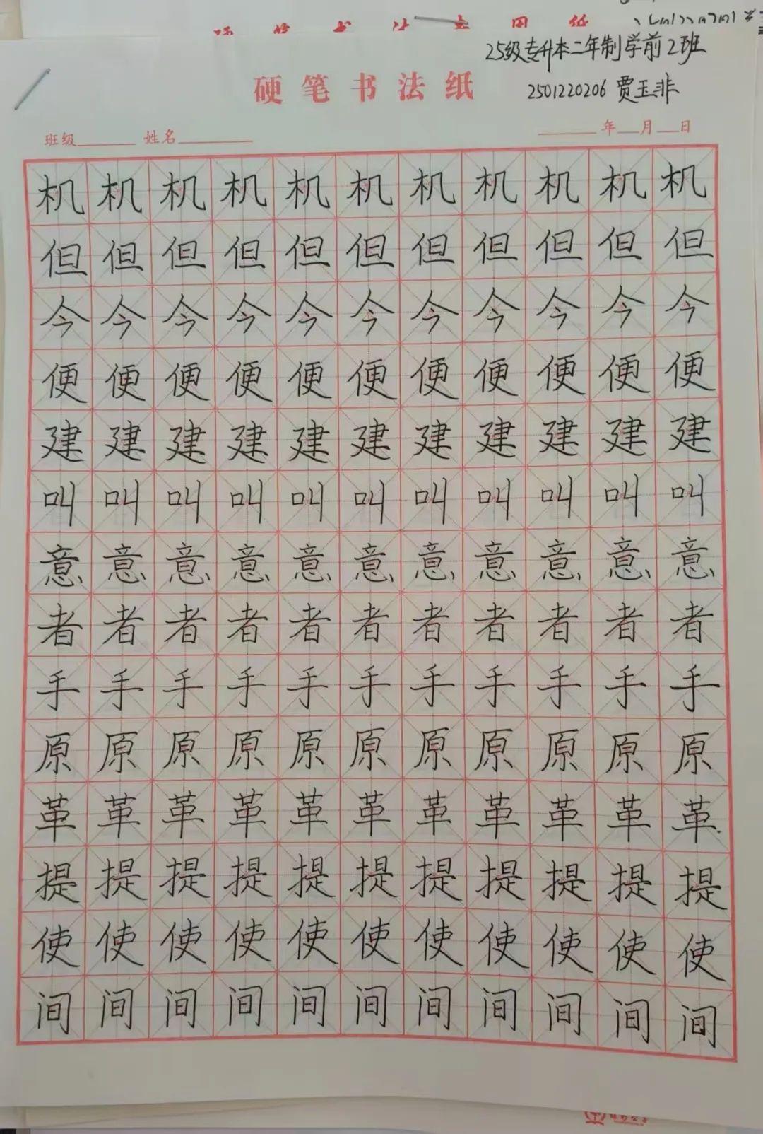 训练过程中,同学们以十足的热忱投入其中:硬笔书写时,同学们沉心于点横撇捺,力求每一个笔画都规范工整;粉笔练习时,同学们专注于笔锋提按,让每一块黑板都成为展示教学功底的舞台,同学们的每一件作品都饱含教育者的审美与情怀。这份认真,是同学们对教师职业的敬畏,更是对未来教育事业的郑重承诺——以扎实的“三字一画”能力为起点,为日后站上讲台、培育桃李筑牢根基。