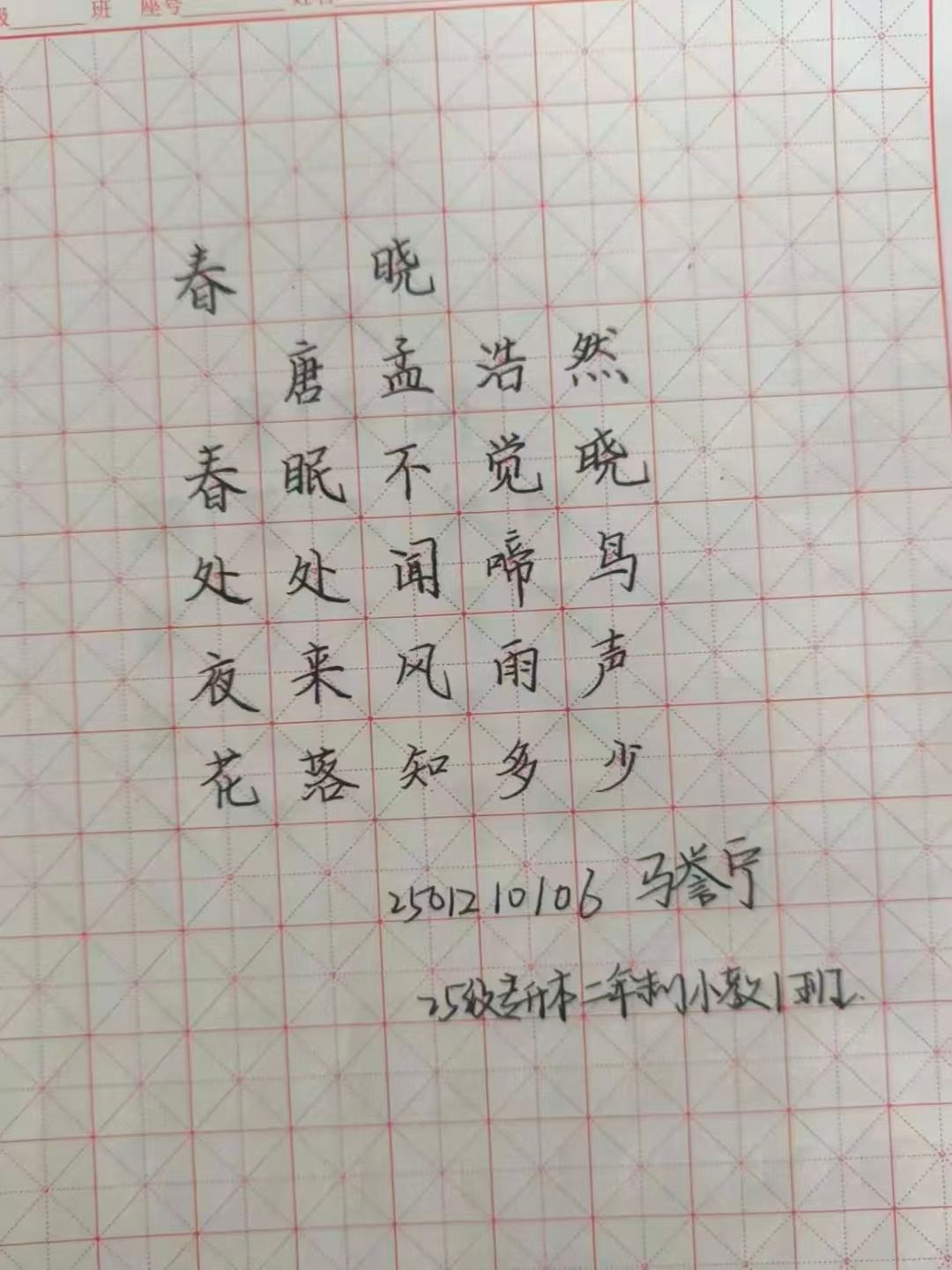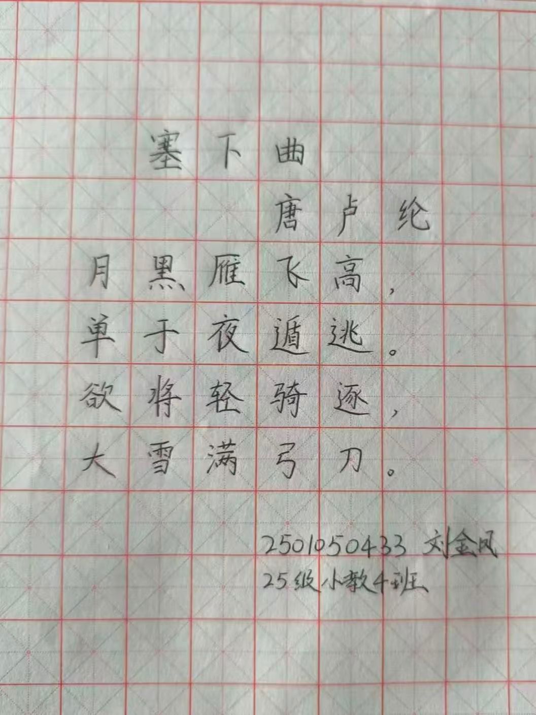 学期训练中,同学们沉心钻研笔画规范与书写架构,把每一次起笔、收锋都当作教学基本功的锤炼,让严谨的态度融入字里行间,力求让每一笔、每一画都彰显教育者的审美与素养。训练场上,既有低头琢磨笔法的专注,也有凝师者责任于笔端的坚定。这份认真,是对教师职业的敬畏,更是对教育事业的承诺。