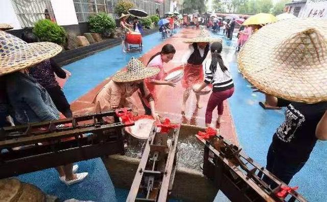 “抢水”是流传于浙江海宁一带的农事习俗,举行这种仪式时,多由年长执事者召集各户,在黎明时分燃起火把,在水车基上吃麦糕、麦饼、麦团,待执事者以鼓锣为号,群人以击器相和,踏上事先装好的水车,数十辆一齐踏动,把河水引灌入田。