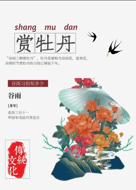 谷雨前后是牡丹花开的重要时段,因此,牡丹花也被称为谷雨花、富贵花。“谷雨三朝看牡丹”,至今山东、河南、私闯在谷雨时节会举行牡丹花会,供人们游乐聚会。