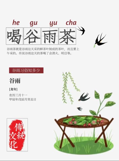 南方谷雨有摘茶习俗,传说谷雨这天的茶喝了会清火、辟邪、明目等。所以谷雨这天不管是什么天气,人们都会去茶山上摘一些新茶回来喝。