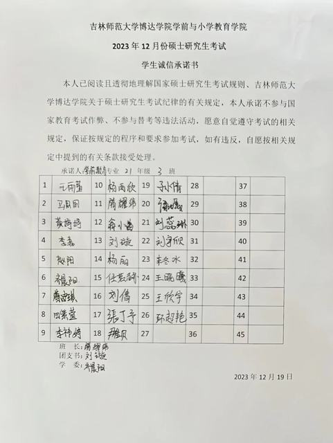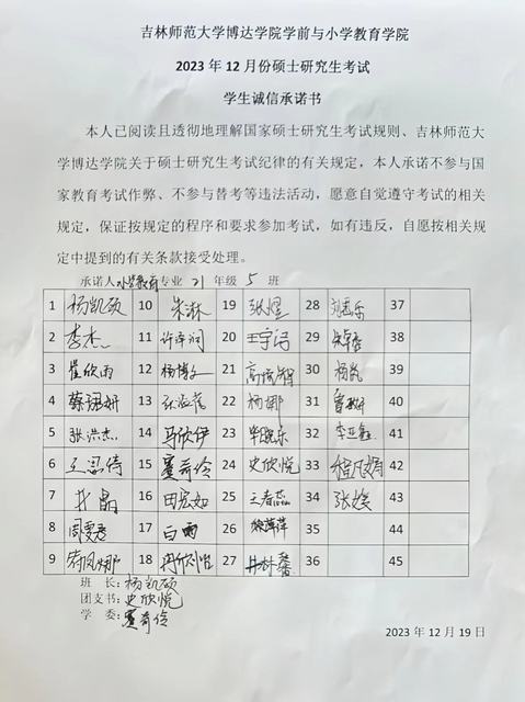星辰流转、岁月更迭,又是一年考研时。为树道德之新风,立诚信之根本,营造公平公正的考试环境,学前与小学教育万博体育官网组织开展了“2023 年12月份硕士研究生考试学生诚信承诺书”签署大会。