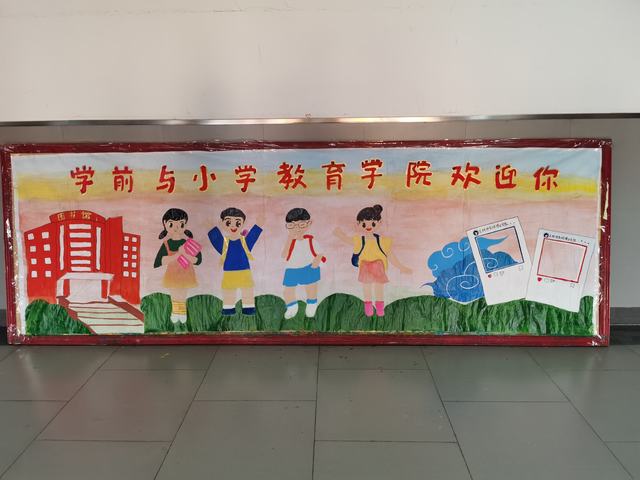 宣传部为新生绘制迎新板报,用自己专业所学营造了温馨活泼、积极向上的迎新氛围,并转达了师长、学姐学长们热烈欢迎新生入学的美好祝愿。
