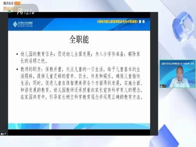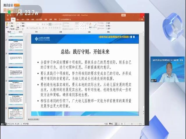 虞永平教授聚焦于“守准则、树师德、铸师魂”的主题,从全面理解幼儿园教师职业、深刻理解幼儿园教师职业准则和自觉践行幼儿园教师职业准则三个角度出发进行了阐述。
