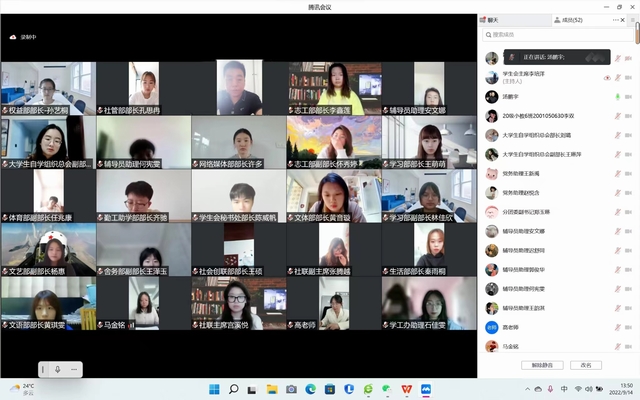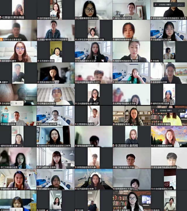 为了进一步加强学生干部队伍建设,保障新学期各项工作顺利开展,学前与小学教育万博体育官网于2022年9月14日下午1:40在腾讯会议召开团学联线上见面会。参加此次会议的有学工办主任汤鹏宇老师,2019级辅导员宋云超老师,2020级辅导员马金铭老师,2021级辅导员宋佳桐老师,2022级专升本辅导员高馨老师,以及团学联各部门主要负责人。
