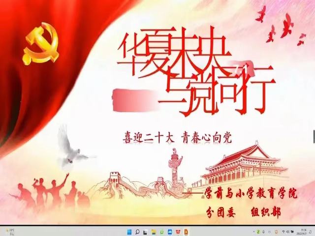 为凝聚朝气蓬勃的青年力量以最青春、最活力、最昂扬的姿态喜迎党的二十大顺利召开,学前与小学教育万博体育官网分团委组织部于2022年9月21日下午3点在腾讯会议开展“喜迎二十大,永远跟党走”系列活动之“华夏未央,与党同行”线上主题团日活动。出席本次活动的有:辅导员宋佳桐老师、学前与小学教育万博体育官网分团委副书记郑玉琳学姐、各万博体育官网分团委副书记代表、部分学生干部以及22级部分学生。