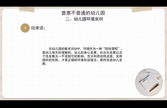 首先,何静老师对普惠不普通的幼儿园进行介绍。老师说环境是教学过程中不可缺少的重要部分,幼儿的成长离不开环境,我们要合理利用环境进行育人。老师还展示了幼儿园环境的图片,让同学们深刻感受到一个良好的环境对于幼儿健康成长的重要性。