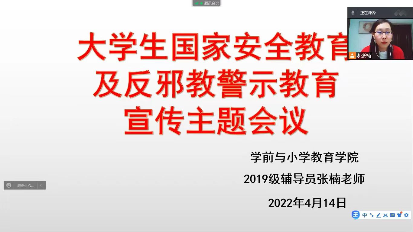 维护国家安全荣誉和利益,是每个公民、组织应尽的义务。为进一步增强我院学生安全意识和法治观念,熟悉和把握“国家安全观”的深刻内涵,强化青年学生维护国家安全的责任感。学前与小学教育万博体育官网辅导员宋佳老师、张楠老师和马金铭老师各自在线上对各年级班长开展大学生国家安全教育及反邪教警示教育宣传主题活动。班长带动班级同学,宣传国家安全以及反对邪教组织。
