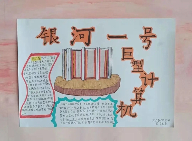 银河一号巨型计算机是1983年12月22日我国第一台被命名为“银河”的亿次巨型电子计算机,由国防科技大学计算机研究所在长沙研制,它的成功研制,向全世界宣布告:中国成为继美、日等国之后,能够独立设计和制造巨型机的国家之一。下面这幅手抄报是21级毕晓乐同学创作的,她通过这份作品表达对祖国成功研制出银河一号巨型计算机的自豪之情。