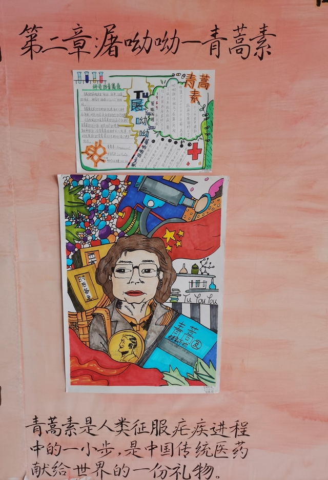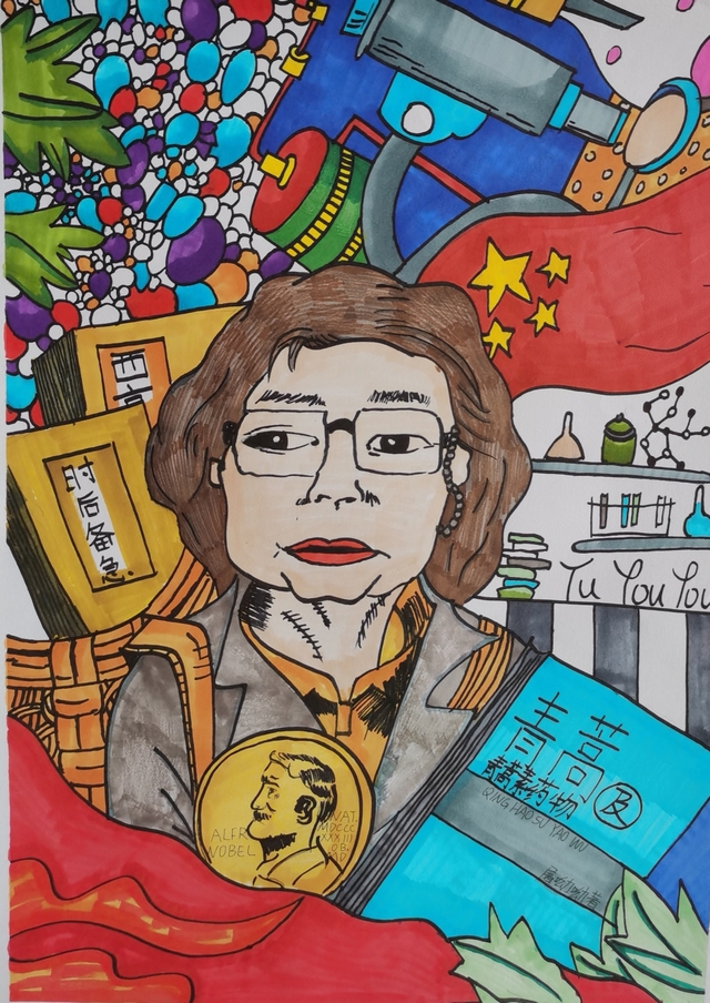 屠呦呦是第一位获得诺贝尔科学奖项的中国本土科学家、第一位获得诺贝尔生理医学奖的华人科学家。她多年从事中药和中西药结合研究,创制出新型抗疟药青蒿素和双氢青蒿素,并用其治疗了耐药性的疟原虫和红斑狼疮,从而挽救了无数人的生命。下面这幅手抄报是21级贺海漪同学创作的,运用精湛的绘画功底将这位受人敬仰的神仙奶奶画于纸上,表达出深深地感激之情。