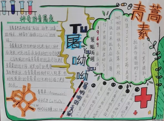 青蒿素及其衍生物是含过氧桥的倍半萜内酯类新型抗疟药,具有高效、快速、低毒、安全等特点,对各种疟疾有效,被誉为“拯救2亿人口”的发现。下面这幅手抄报是20级罗青青同学创作的,其作品主要介绍了青蒿素的神奇妙用,这位同学通过这篇作品表达对屠呦呦发现青蒿素一事的高度颂扬。