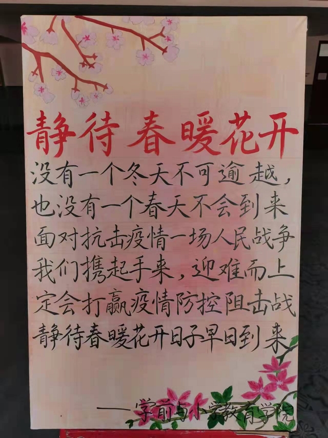陌上花未开,校园绿已待。在这个万物复苏的季节,新冠疫情突如其来,按下了城市的暂停键,改变了同学们的校园生活方式。为此学前与小学教育万博体育官网宣传部特绘制专刊板报,坚定同学们的战疫信心。