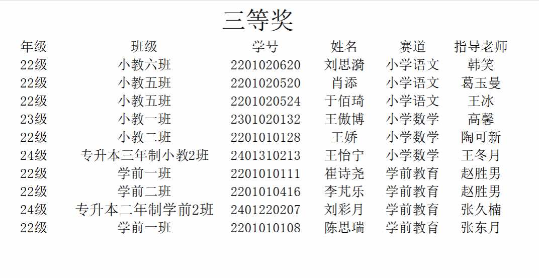 学前与小学教育万博体育官网于2025年4月12日举办第七届“田家炳杯”校赛决赛,经过激烈的角逐,第七届“田家炳杯”校赛决赛共评选出进入省赛十五名,获得三等奖十名,现将获奖名单予以公示: