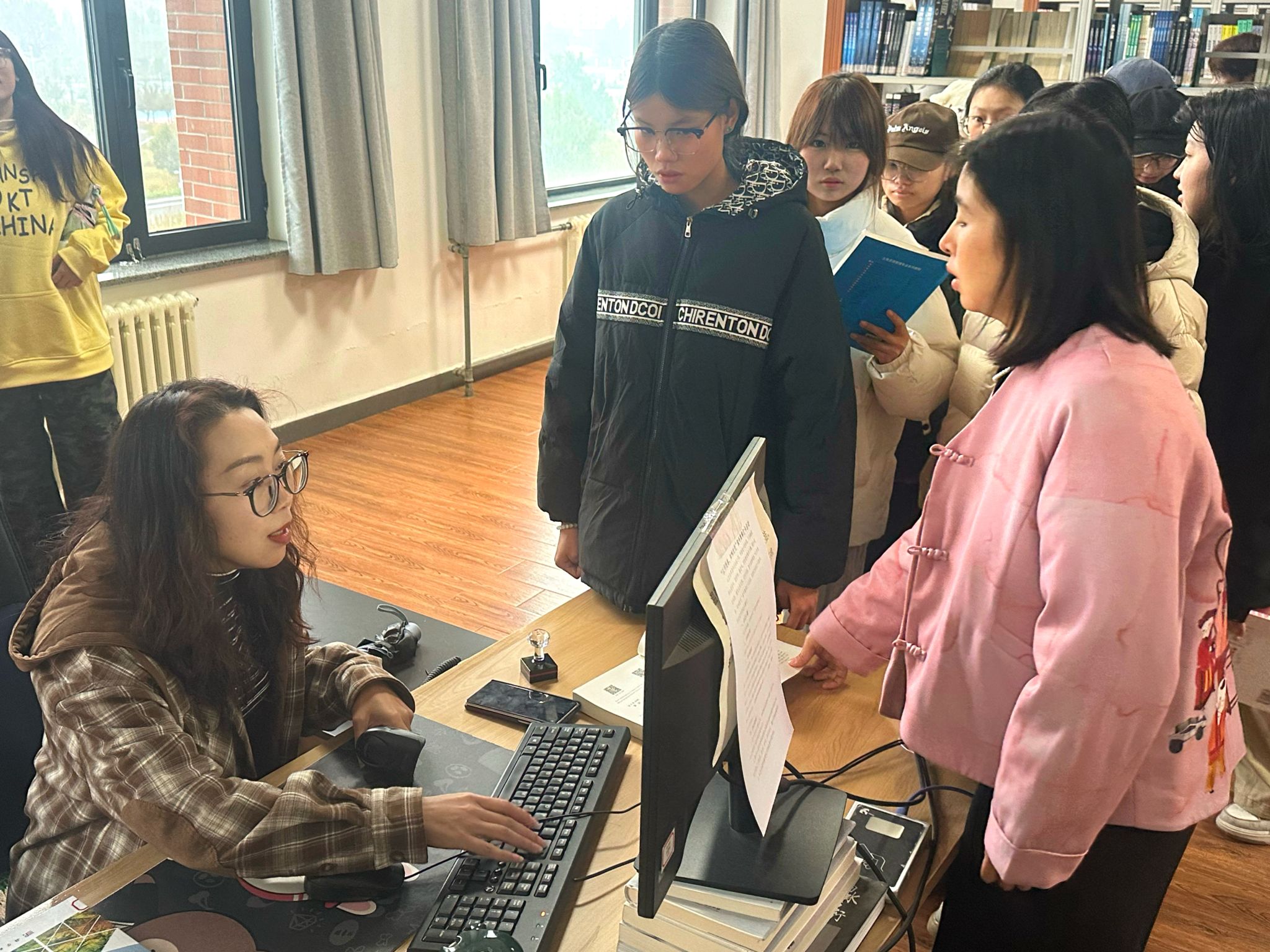 在图书馆工作人员的协同引导下,新生们分批次参观各功能区域。在美术、视觉传达和环境设计等专业书库,教师们结合课程体系,现场推荐核心教材及经典画册等,指导新生快速定位书籍并分享“带着课程问题找资料”的学习方法;在电子资源区,工作人员演示专业数据库检索技巧时,带队教师同步提醒新生,善用数字资源能高效解决创作选题调研、论文素材搜集等问题,是提升学习效率的“利器”。