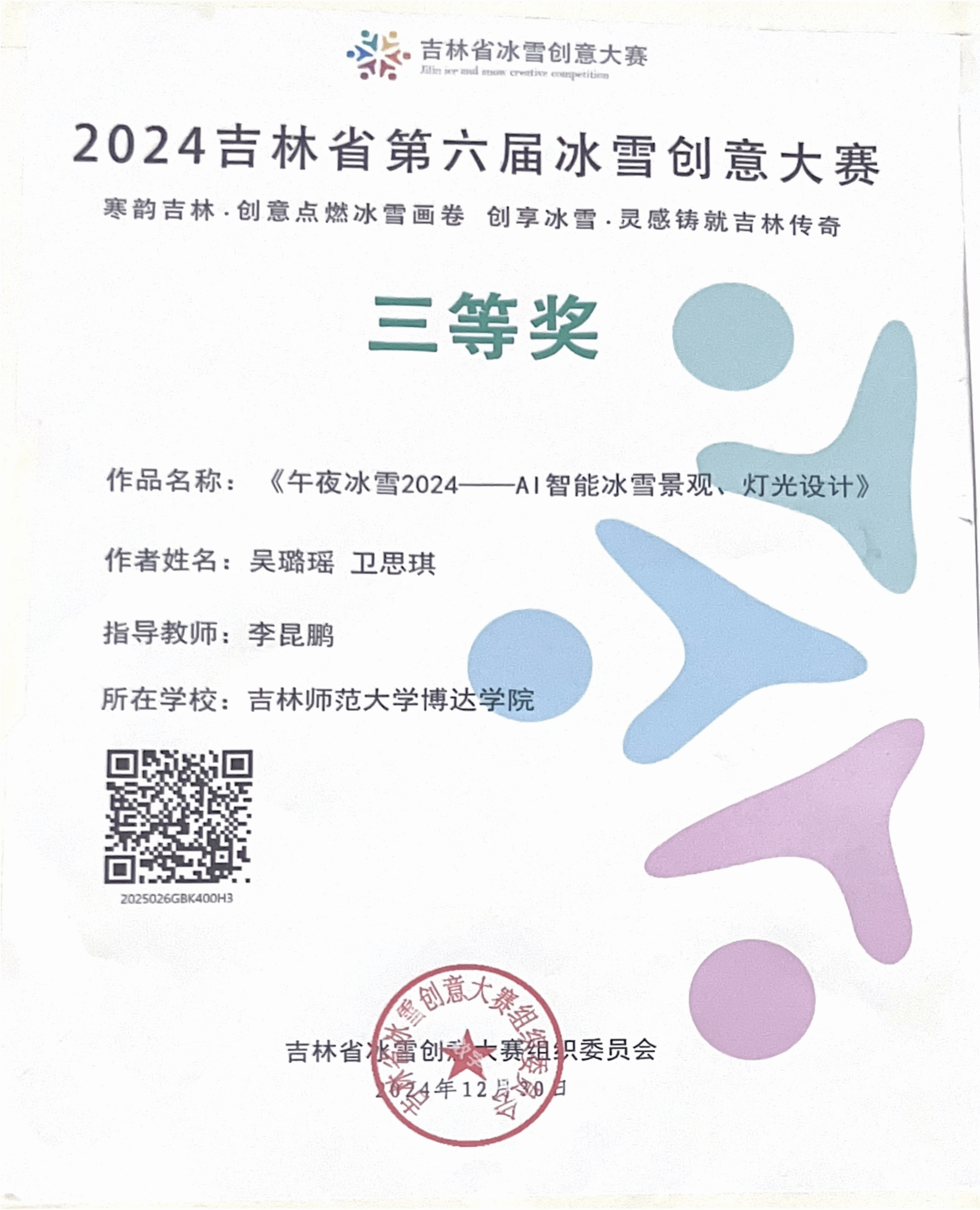 在2024年吉林省第六届冰雪创意大赛中荣获三等奖
