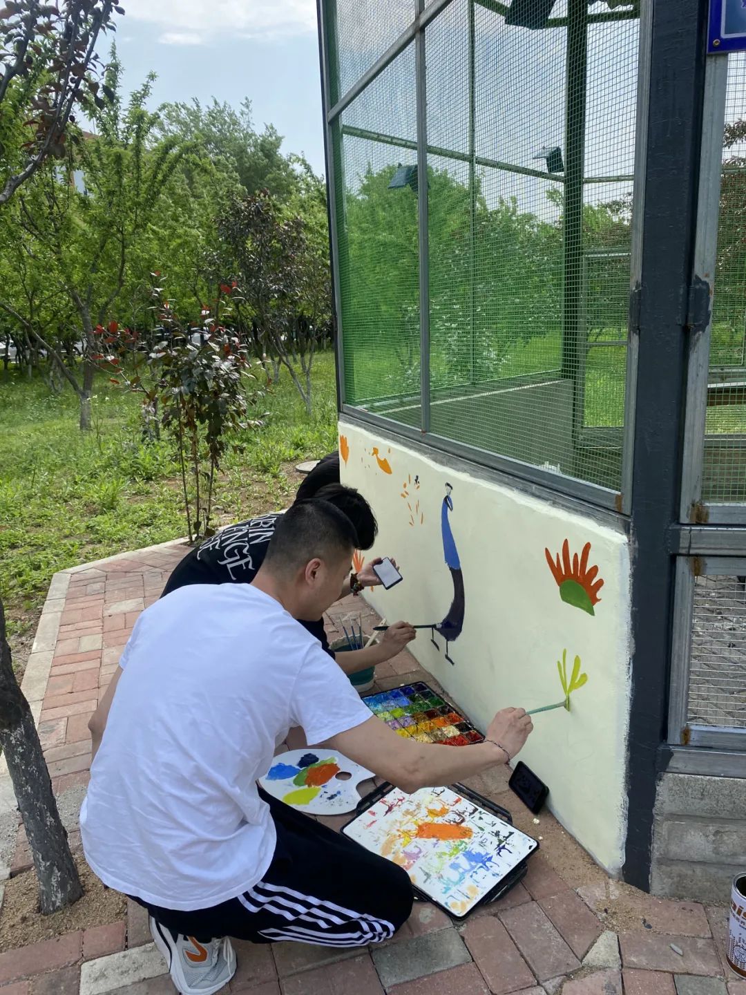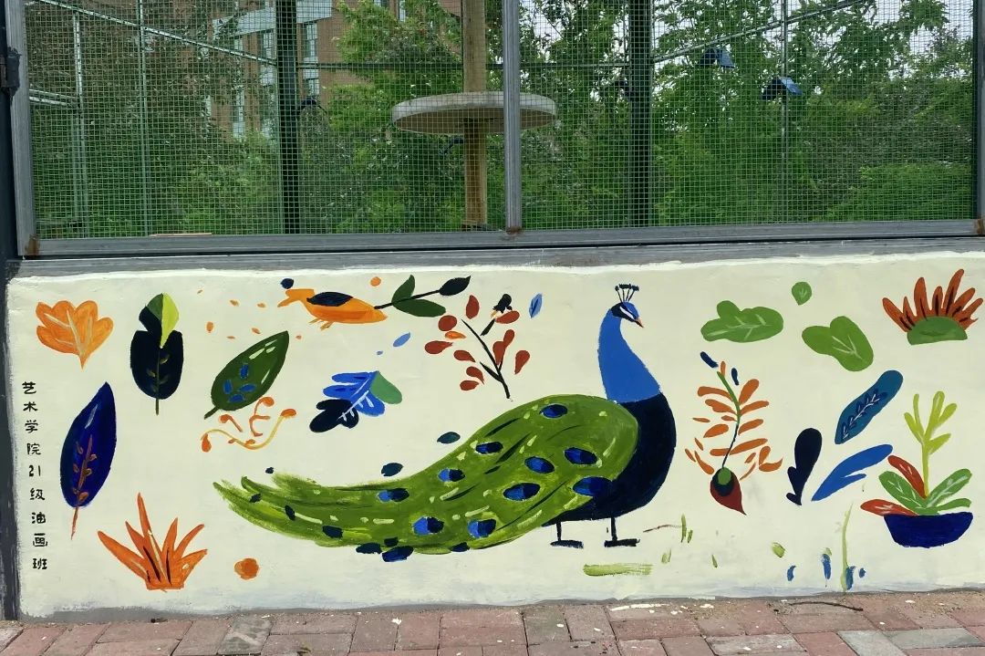 同学们在张大勇老师的指导下,充分发挥自己的专业所长,为孔雀园的墙面绘制色彩绚丽的图画。他们以“孔雀”为元素,结合万博体育官网特色和周围环境,有条不紊的进行着墙面绘画,起型,局部上色,勾画轮廓线,细节塑造。最后,由王湛迪老师在墙面提字,丰富多彩的绘画,让原本单调的墙壁变成艺术感十足的“打卡点”。