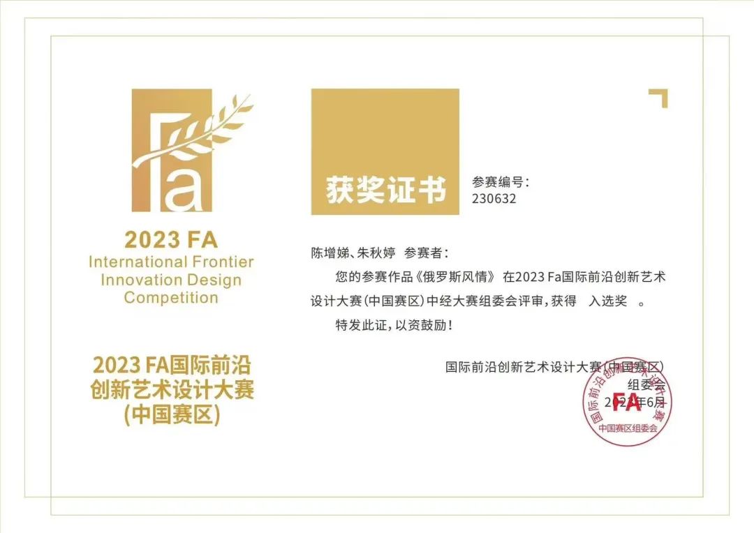 在“2023 FA国际前沿创新艺术设计大赛”中,朱秋婷、陈增娣两位同学创作的《冰雪世界、万物共生》荣获银奖,《俄罗斯风情》、《渔见渔民画》两个作品荣获入选奖。