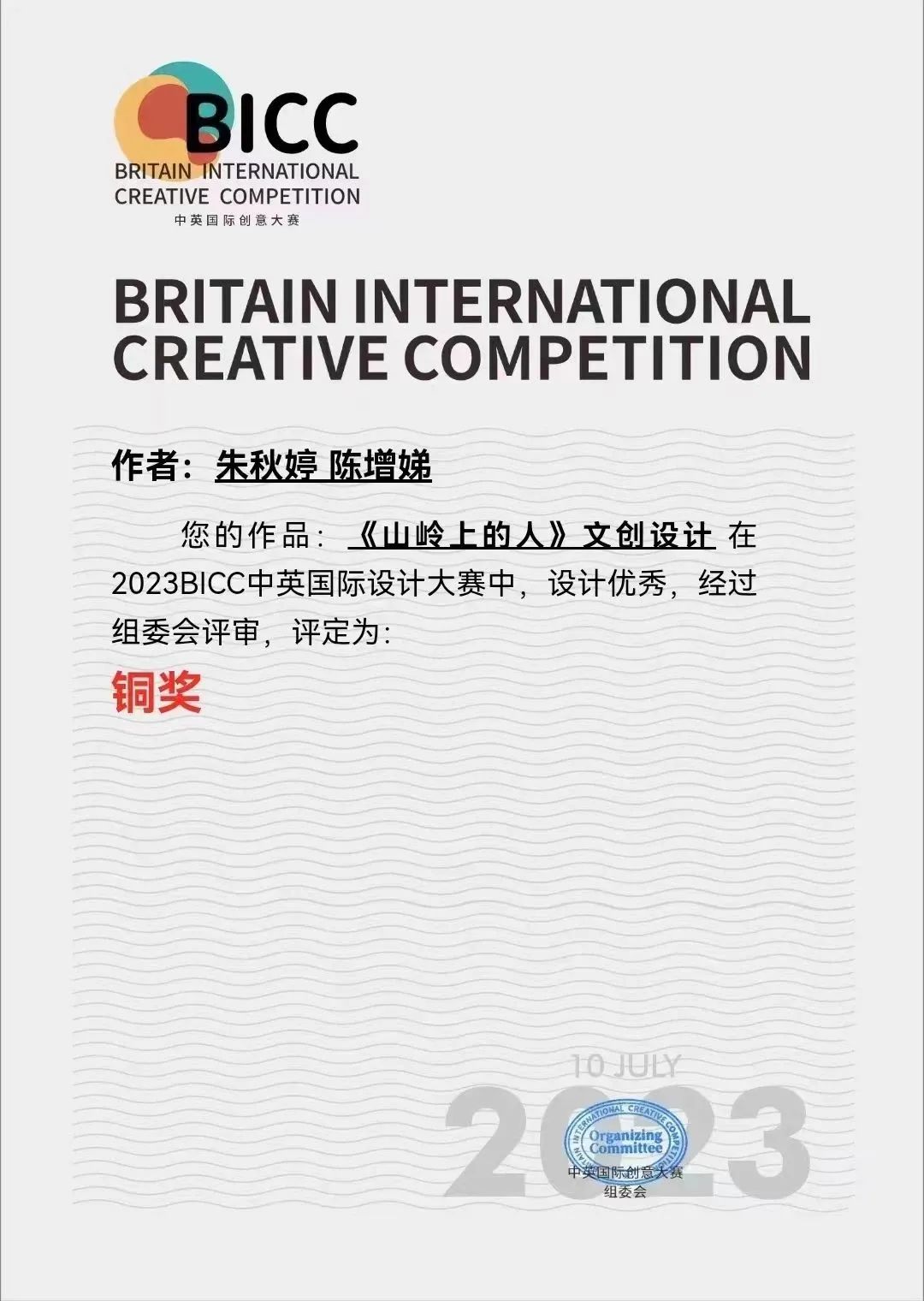朱秋婷同学和陈增娣同学的作品《山岭上的人》文创设计获得铜奖。