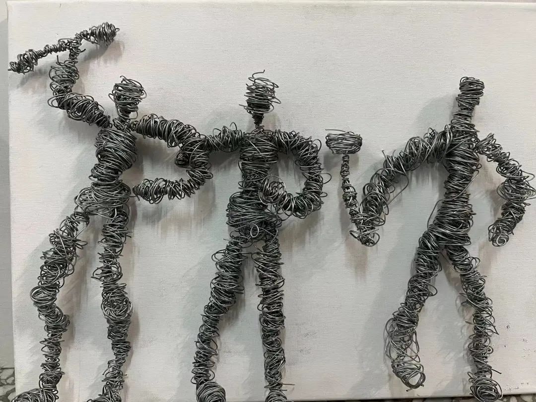 这个作品是由铁丝环绕缠绕而成的。先做成人体的框架骨头,经过大量铁丝的缠绕,由铁丝来组成人体的肌肉、头发、裙子等等部位。