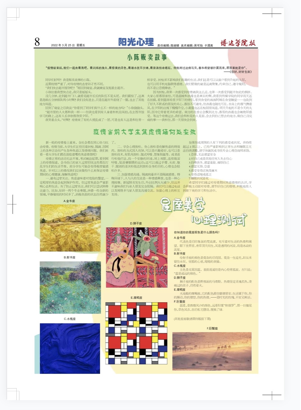 转眼间我已进入大三,接下来小陈会继续努力,不辜负假期生活,好好规划剩余的大学时光。我想借此次的专访由衷的感谢吉林师范大学博达万博体育官网,感谢艺术万博体育官网为我提供的学习平台,感谢老师的指导、同学的帮助。