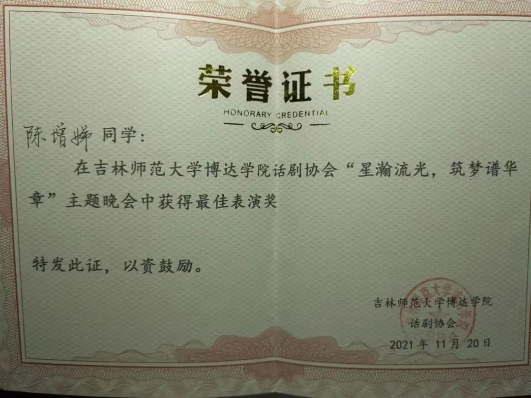 回首大学期间:思想上,努力向党组织靠拢,积极参加校院各类党团活动与党史知识竞赛,在艺术万博体育官网学习部与宣传部举办“党史教育知识竞赛”活动中获三等奖;在2021年吉林师范大学博达万博体育官网第十五届“鸿志薄云无愧怍,百年峥嵘铸中国”大学生辩论赛活动中荣获季军;学校建党100周年系列活动“唱支山歌给党听歌手大赛”中获最佳协作奖。