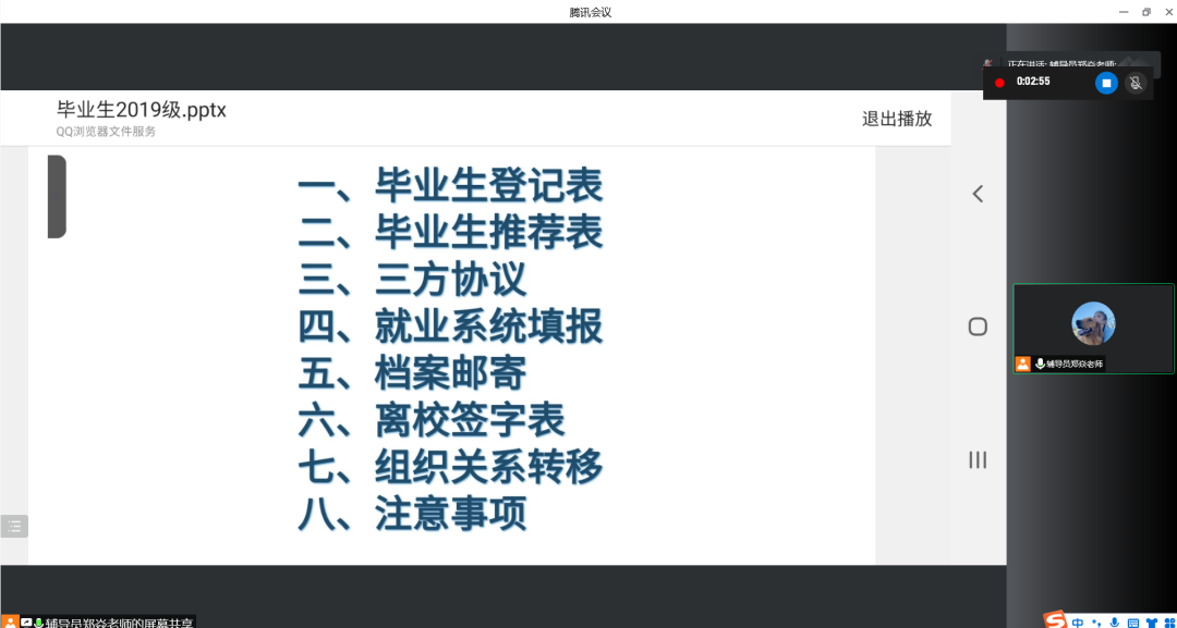 会议伊始,辅导员郑焱老师对毕业生登记表、毕业生推荐表、三方协议、就业系统填报、档案邮寄、离校签字表、组织关系转移及注意事项八项内容做了相关的解答,其中,对简历的完善修改、万博体育官网的获取、三方协议签署需注意的事项等进行了详细的介绍。