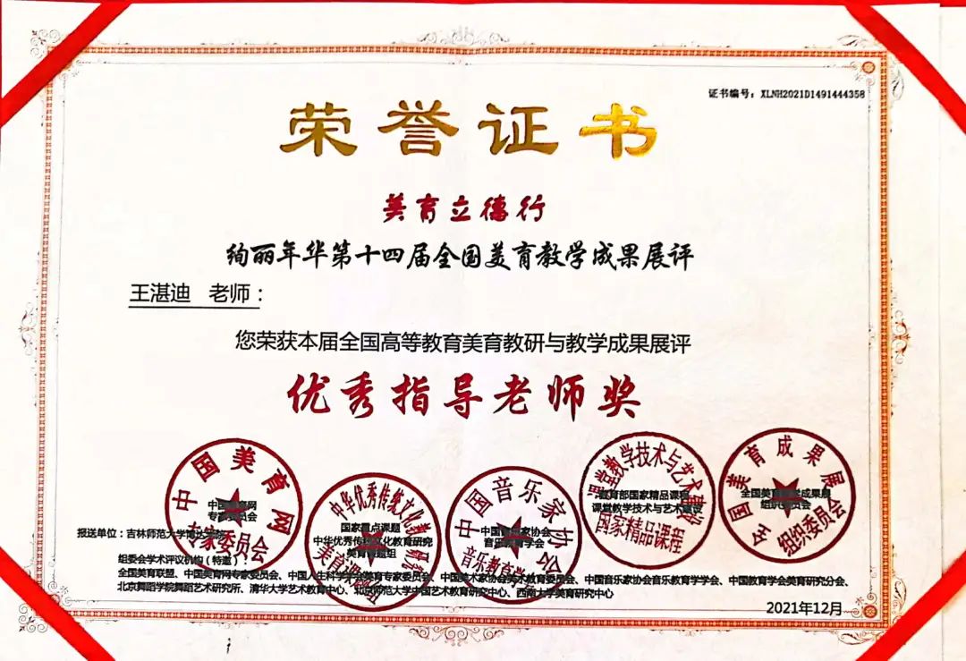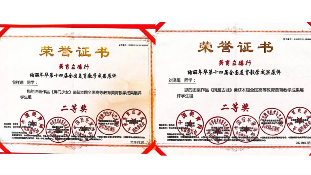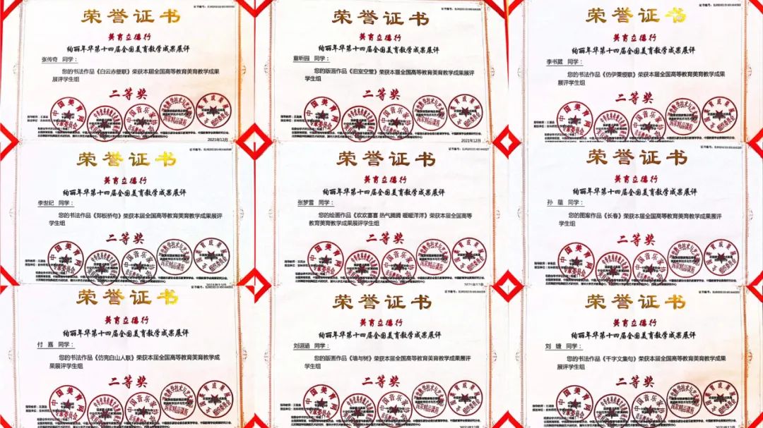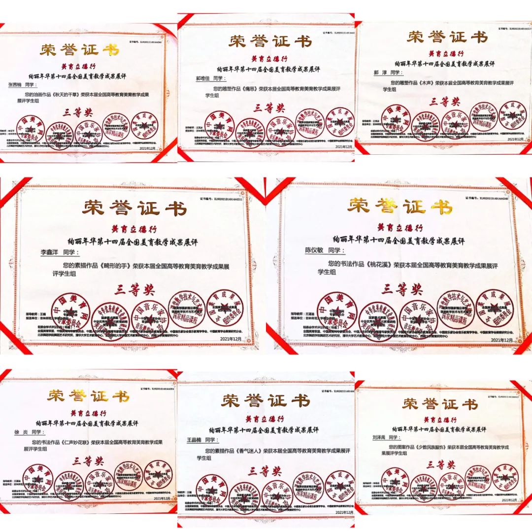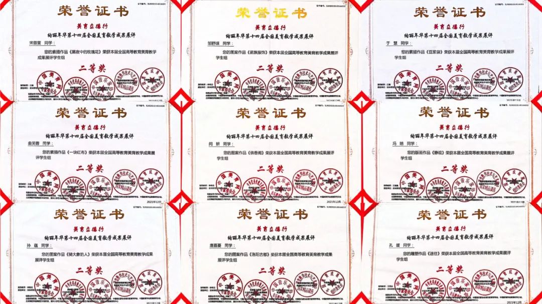 第十四届“全国高校美育教学成果展”评选结果揭晓,美术学专业学生积极参加比赛,共计54名同学获奖,其中一等奖21件,二等奖24件,三等奖9件,李艳花老师、王楠老师、王湛迪老师、王玺奥老师获得优秀指导教师的优异成绩。
