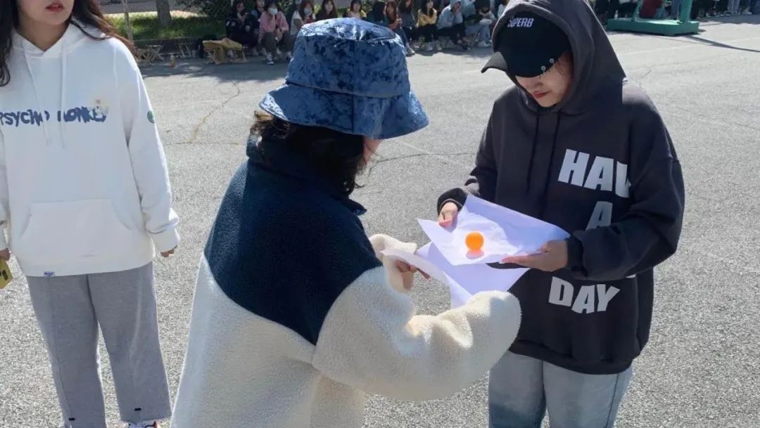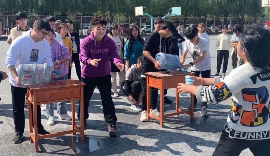 各班出20人参赛,参赛成员拿着两杯水接力,倒入终点的瓶子里,再跑回出发点,由下一名队友接力,最终以瓶子里水多的获胜。