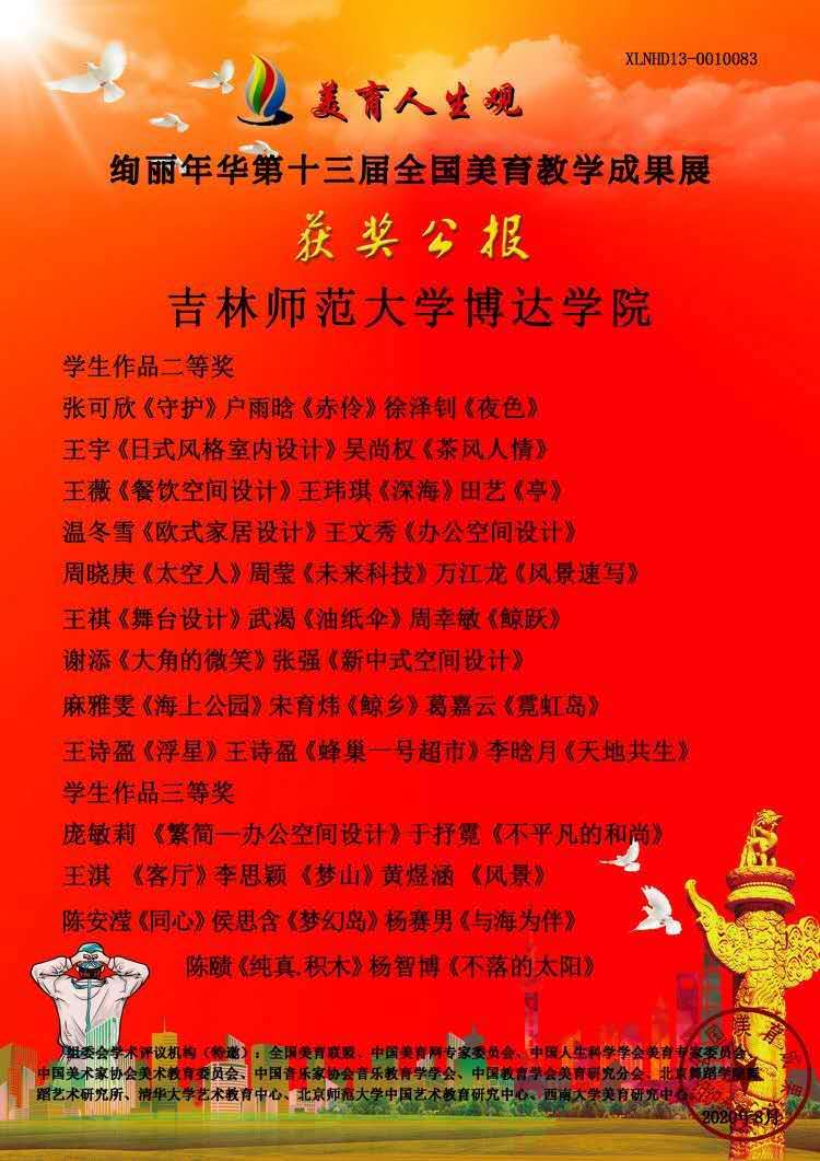 近日,第十三届全国高校美育教学成果展落下帷幕,我院学生53件作品获奖,其中一等奖19项、二等奖24项、三等奖10项。院长潘宝泉教授荣获全国高校美育“先进工作者”,崔景朋、李昆鹏、柴方美、郑佳奇等多位教师获“全国优秀指导教师奖”。这些优秀成绩的取得,是我院在教学、管理工作中坚定落实立德树人根本任务,坚持教育为人民服务,贯彻实施教育部《万博体育官网切实加强新时代高等学校美育工作的意见》的一大成果。