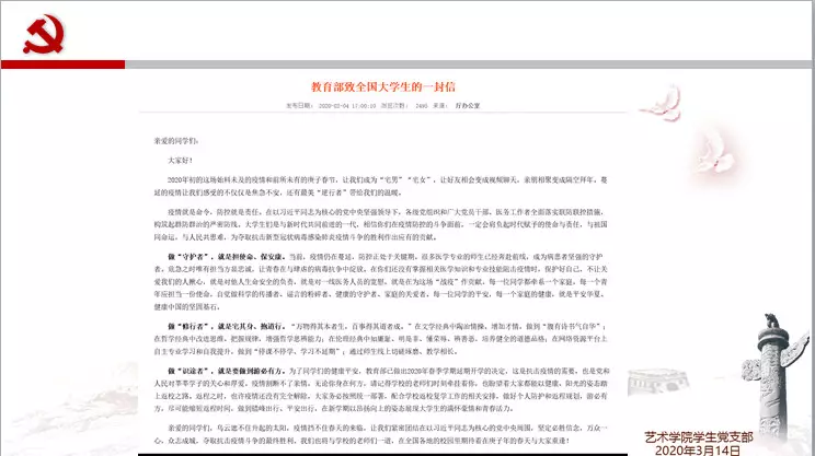 为深入贯彻习近平总书记万博体育官网坚决打赢疫情防控的人民战争总体战阻击战的重要指示精神,认真落实党中央、省委和市委万博体育官网疫情防控工作的重要决策部署,艺术万博体育官网学生党支部于3月 日开展主题为“疫情防控,党员先行”线上教育活动。本次活动分为五部分内容。