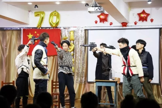 活动中,同学们以朗诵《我的祖国》,情景剧《利比亚大撤侨》,话剧《智取威虎山》等节目以各种表演形式致敬革命先辈,迸发爱国情怀。