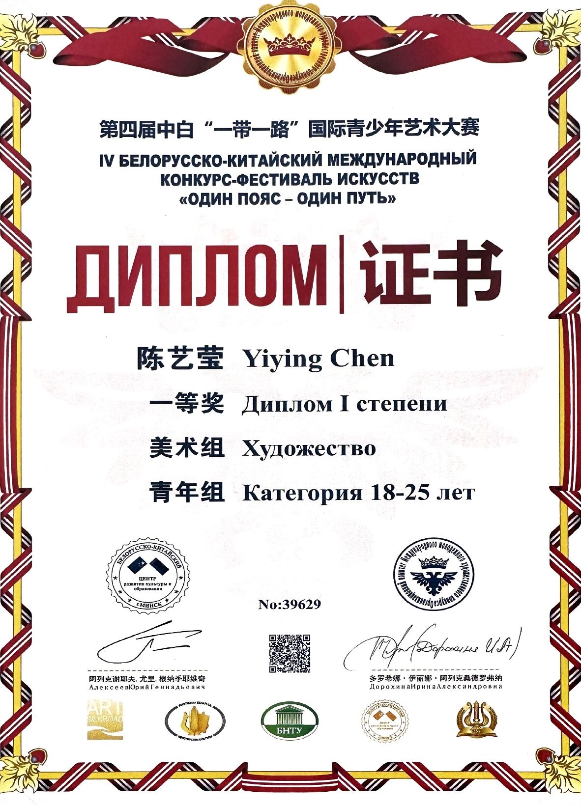 获得第四届中白”一带一路“国际青少年艺术大赛一等奖