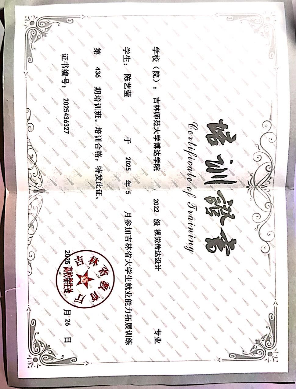 在2025学年度获得吉林省大学生就业能力拓展训练培训班合格证书