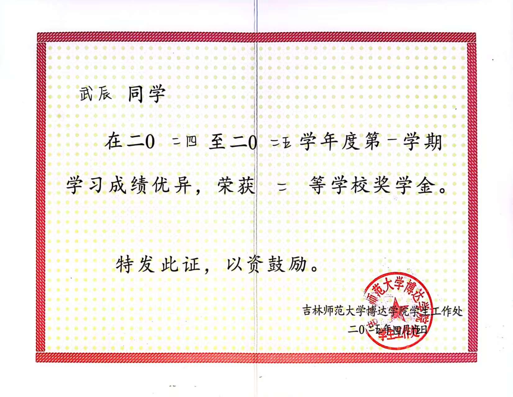 在2024-2025学年度第一学期荣获二等专业奖学金