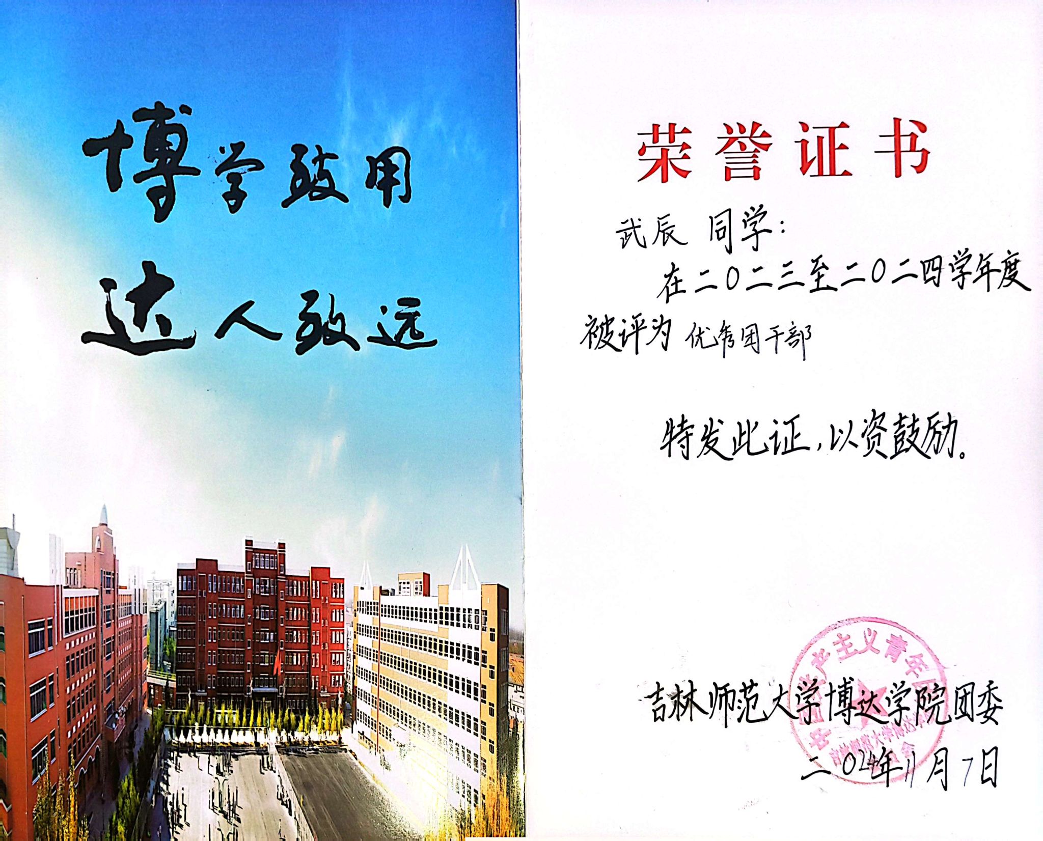 在2023-2024学年度被评为“优秀团干部“荣誉称号
