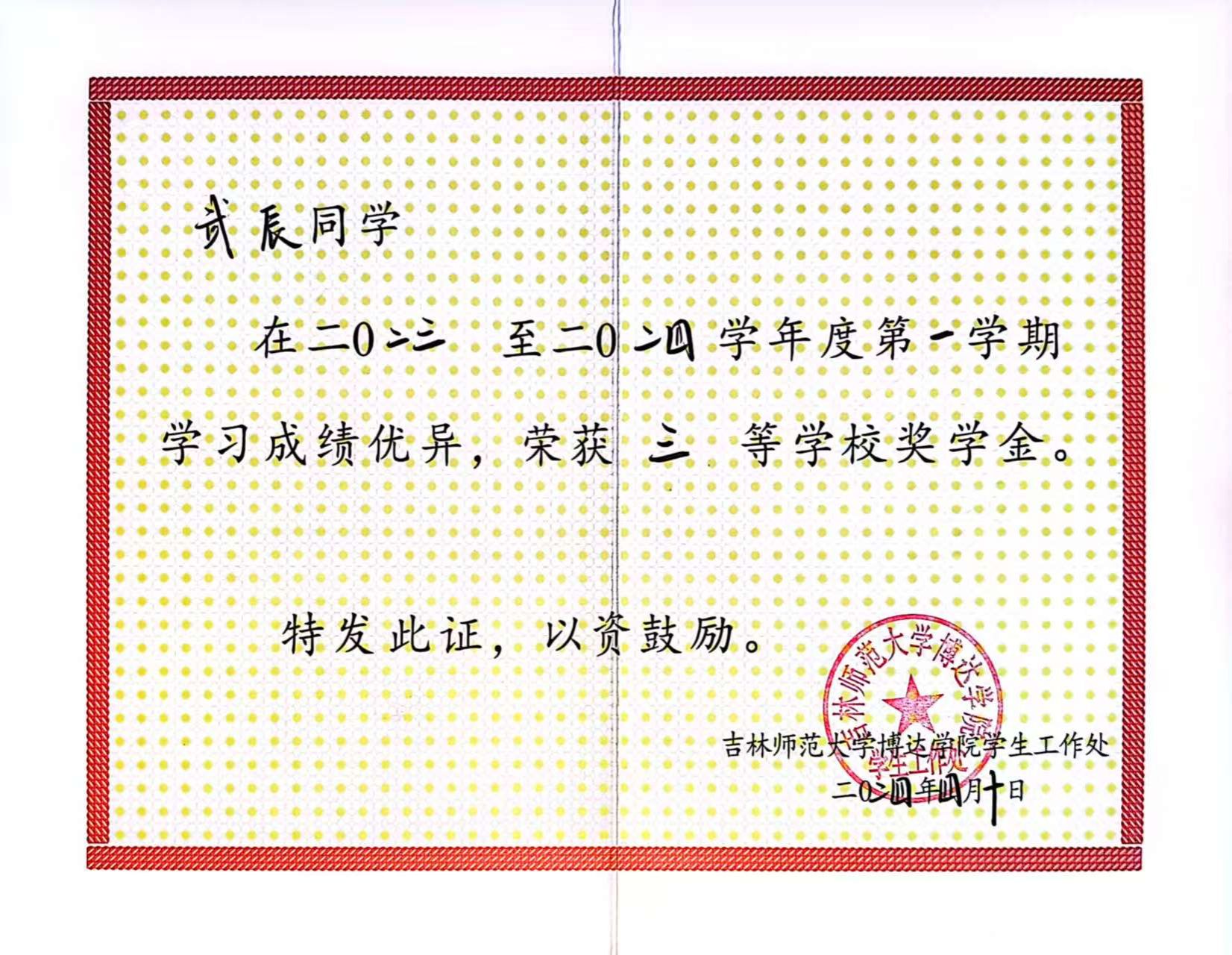 在2023-2024学年度第一学期荣获三等专业奖学金