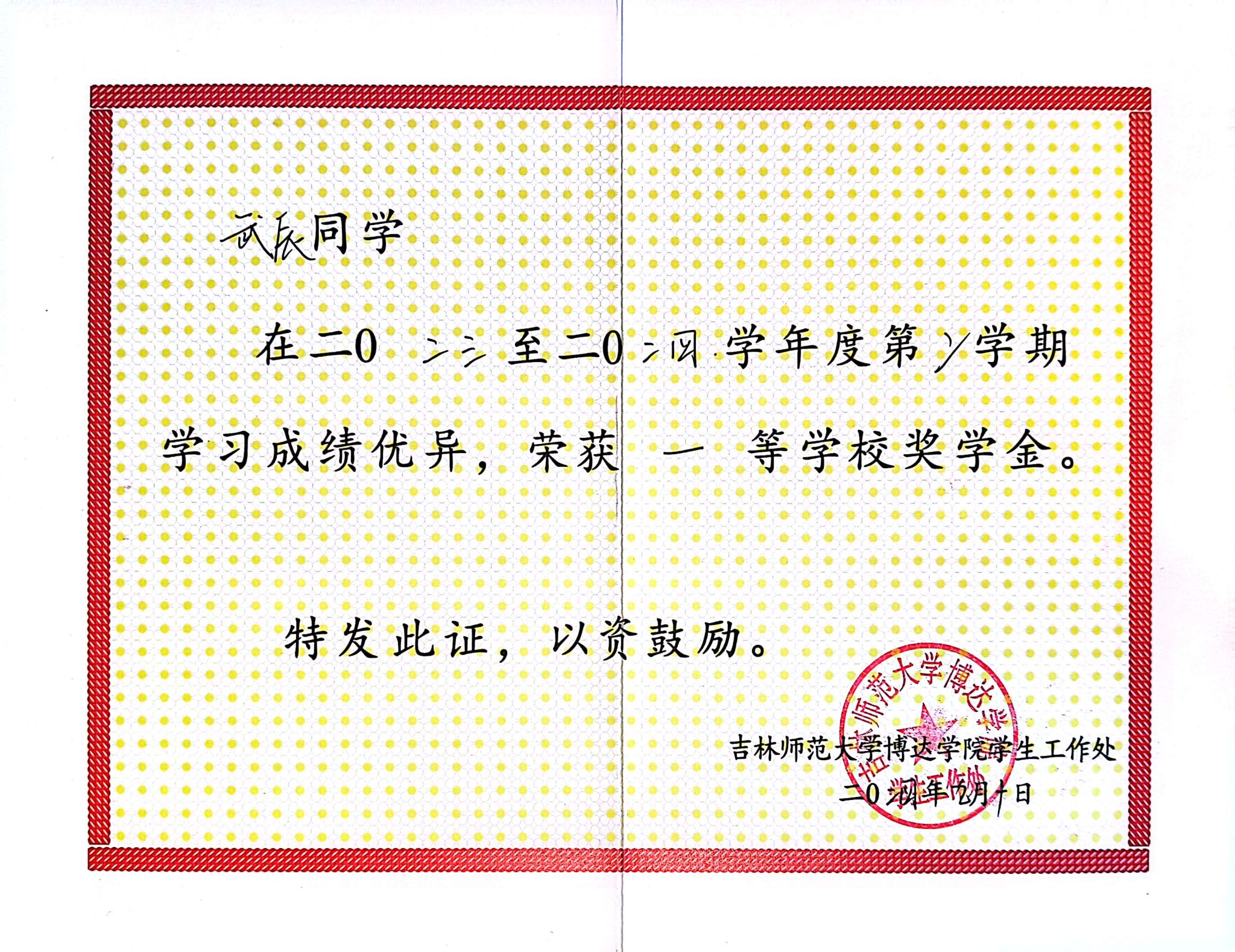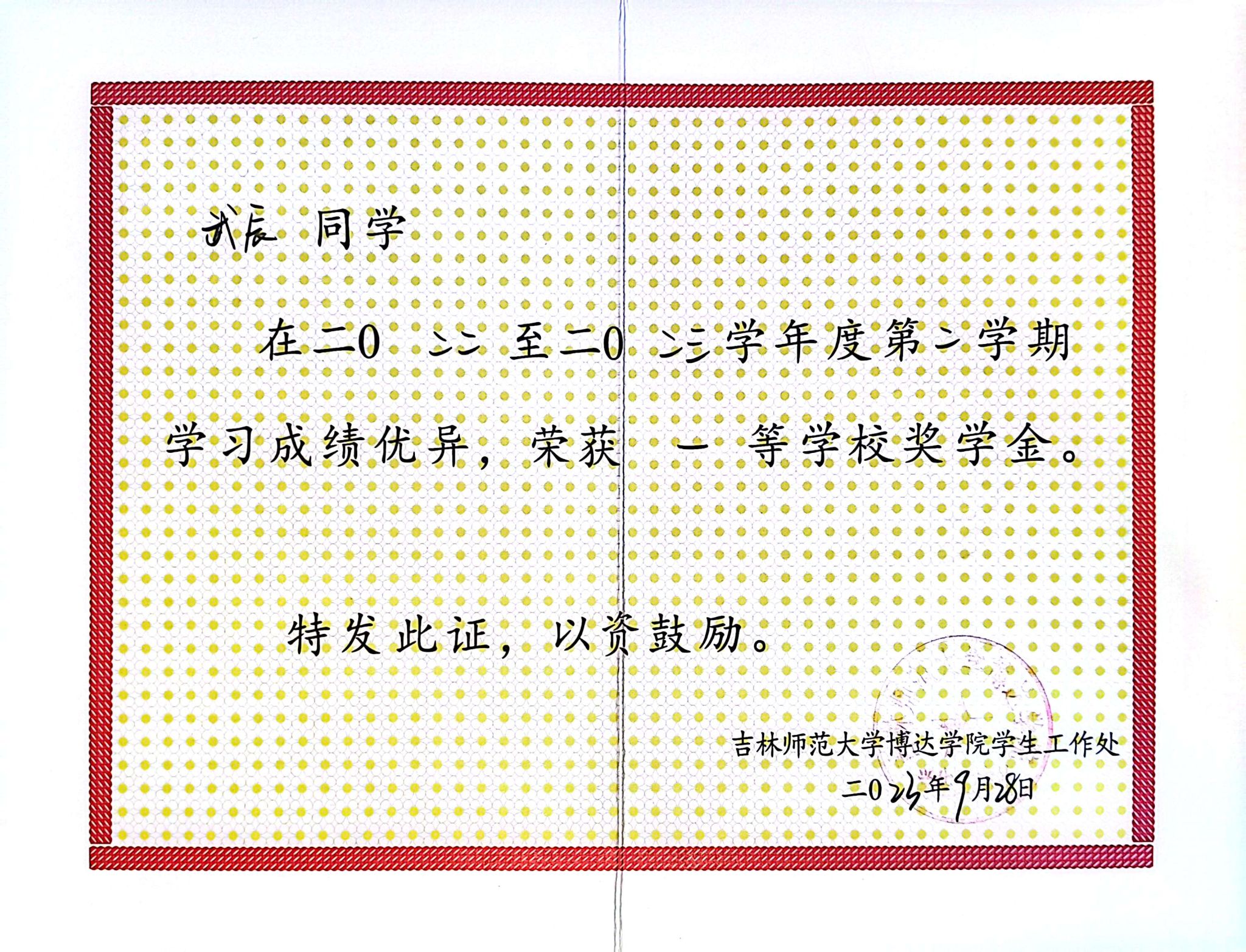 在2024-2025学年度第二学期荣获一等专业奖学金